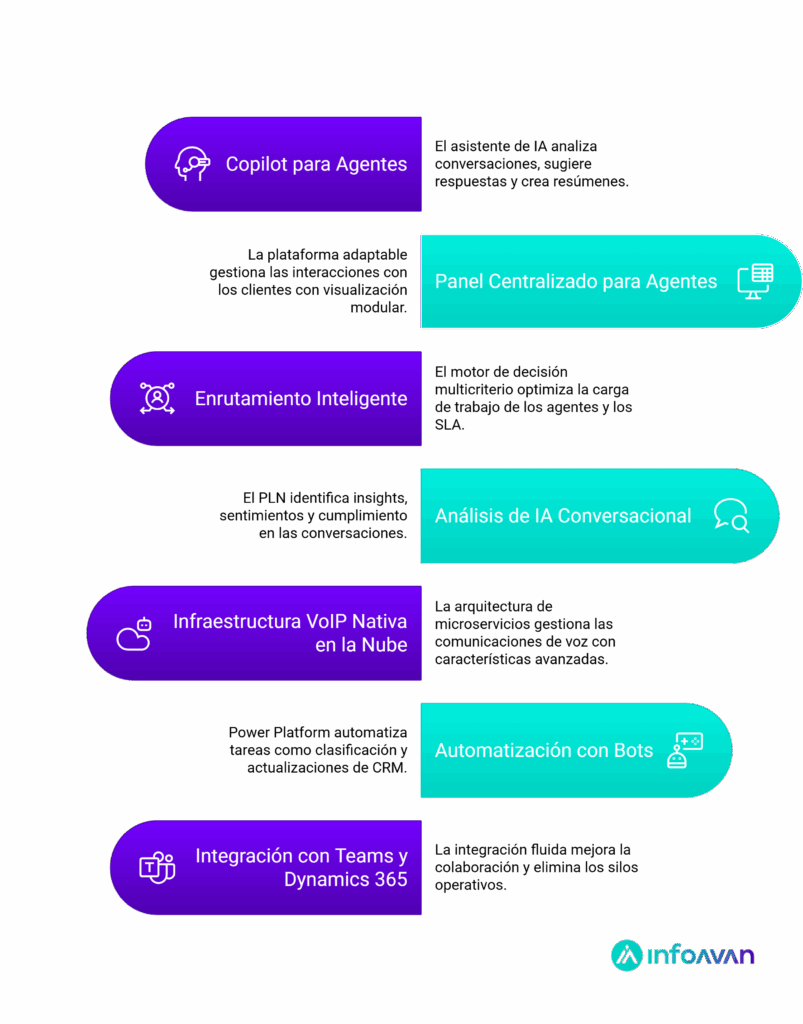 Inspirado en los avances en IA conversacional y en el nuevo paradigma de trabajo asistido, Dynamics 365 Contact Center pone a disposición de los agentes y supervisores herramientas diseñadas para mejorar la experiencia de cliente, elevar la eficiencia y aumentar la inteligencia operativa.